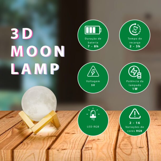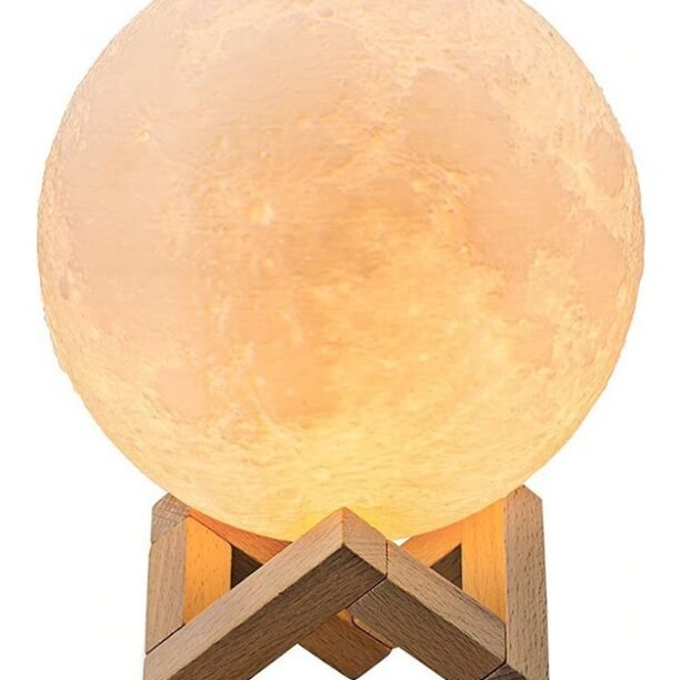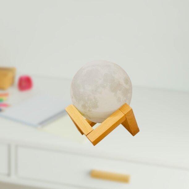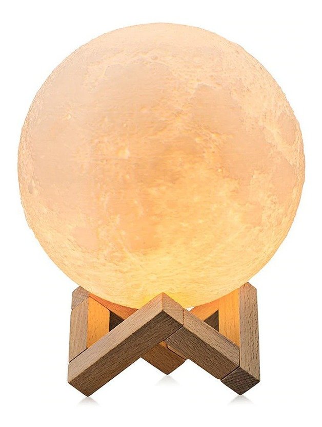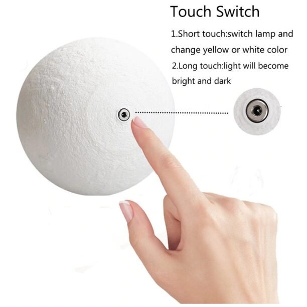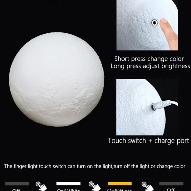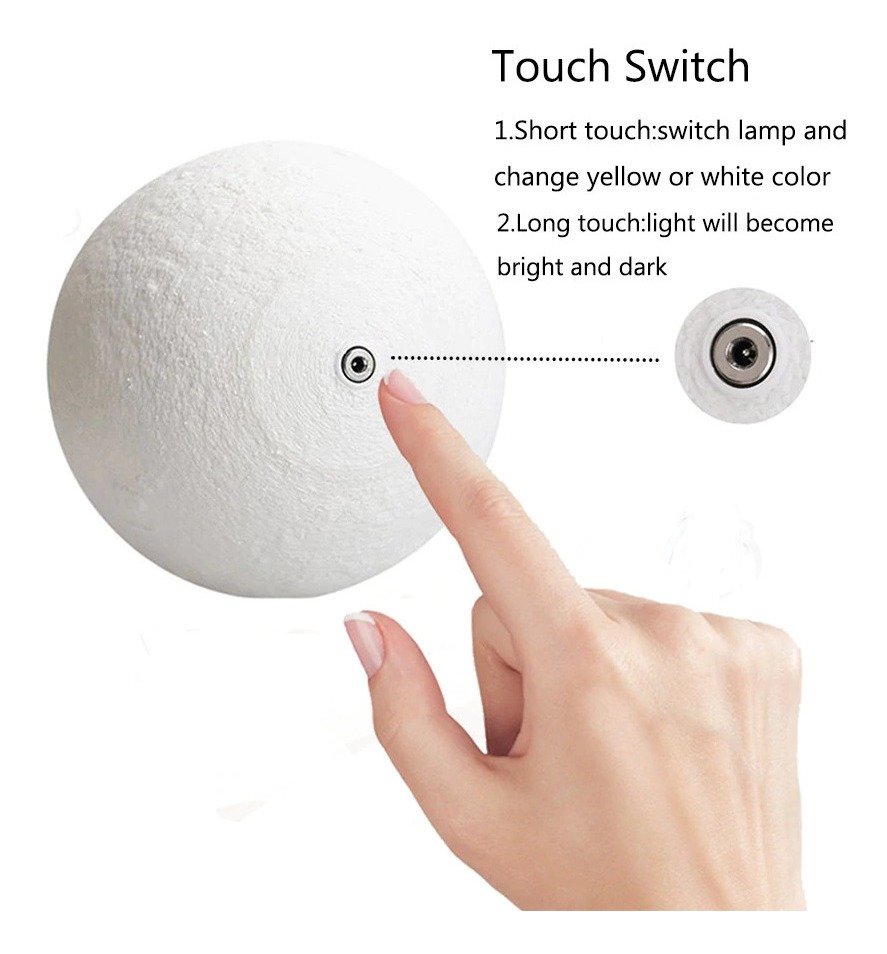 1. toque o anel de metal na parte inferior da lâmpada da lua para ligar/desligar a luz e mudar a cor do branco para o amarelo.