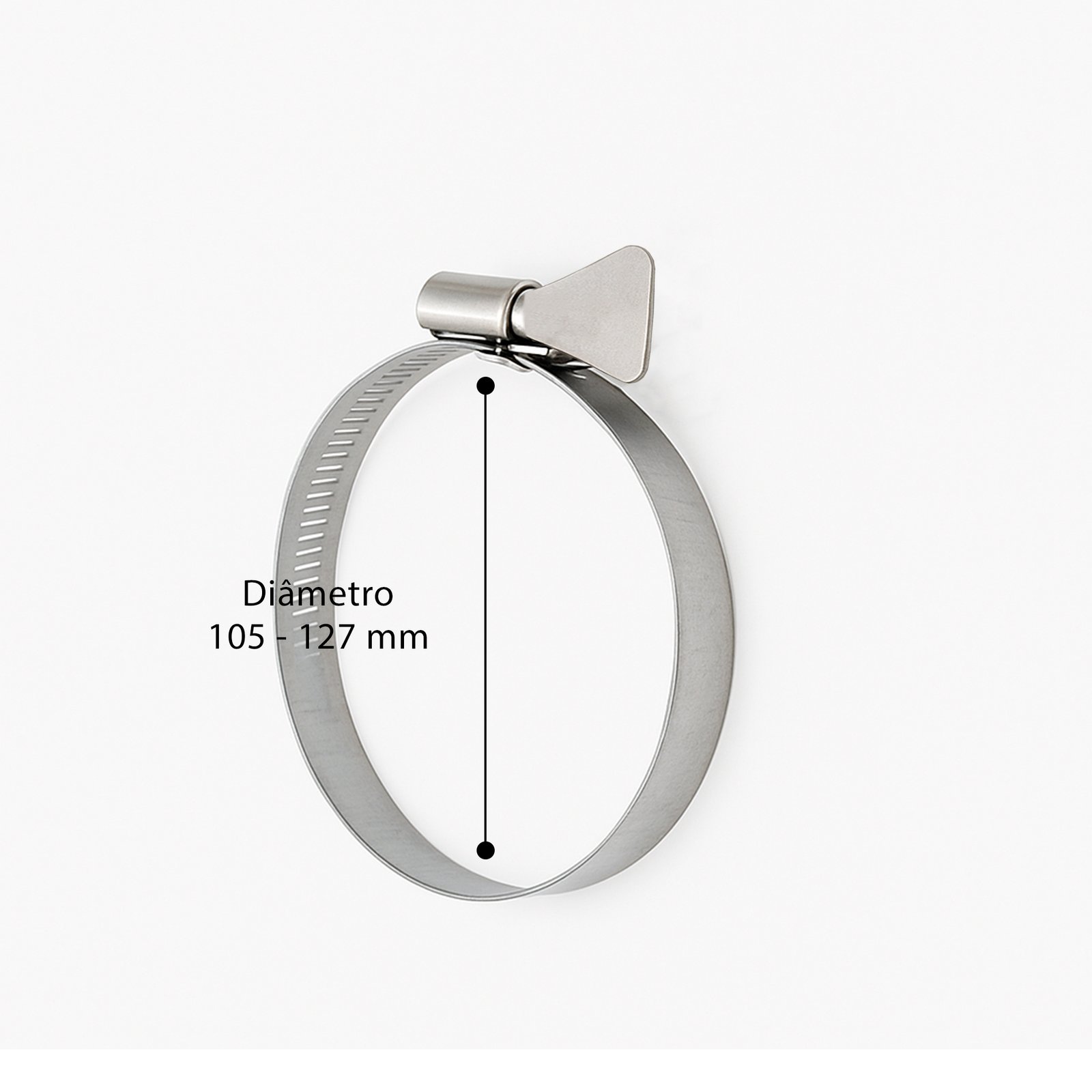 Abraçadeira Borboleta Inox com os intervalos de diâmetro de 105 mm a 127 mm Cor: Cromado Abraçadeira borboleta fabricada em aço inoxidável, resistência, que permite uso externo sem risco de oxidação. Ideal para prender mangueiras, tubos e elementos de irrigação que requerem elevada pressão e grande resistência e durabilidade.