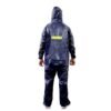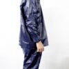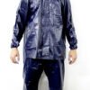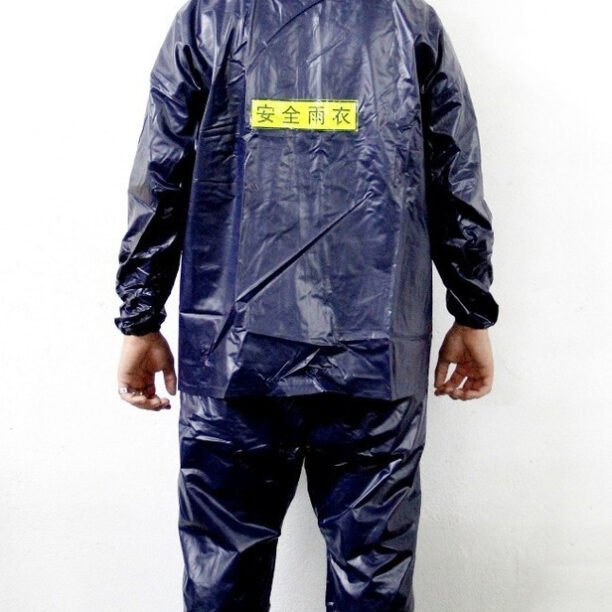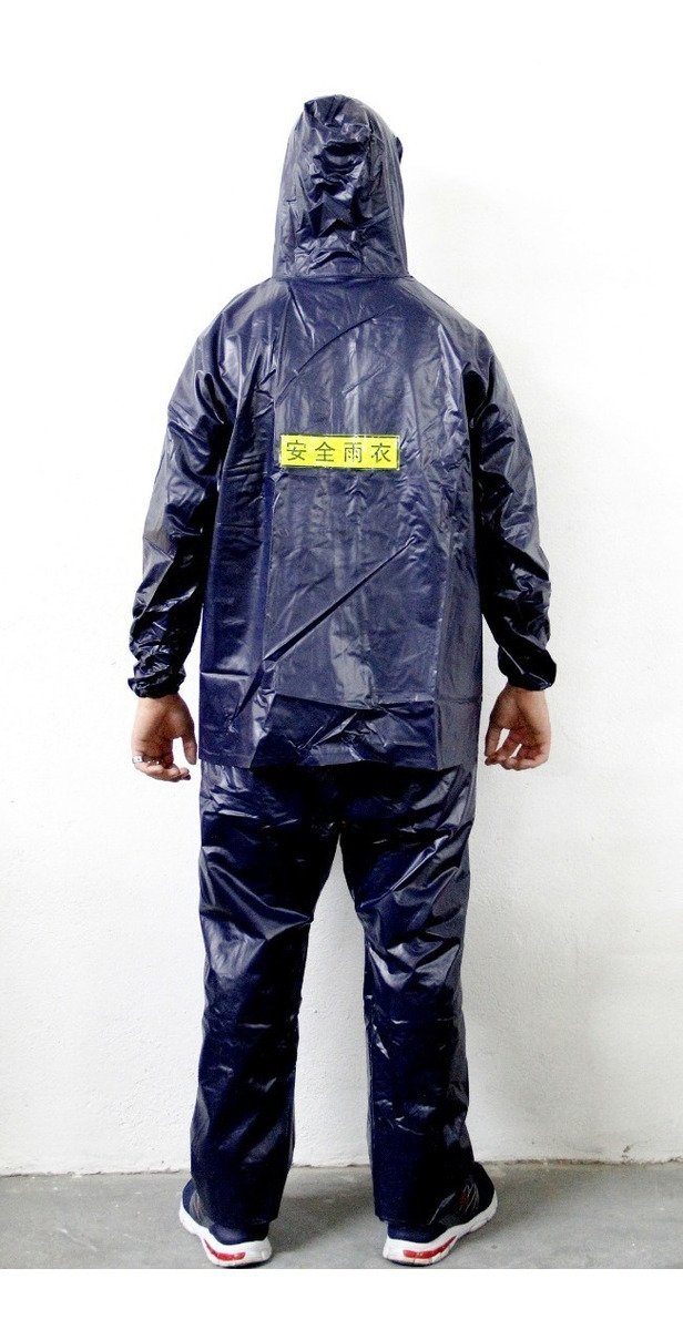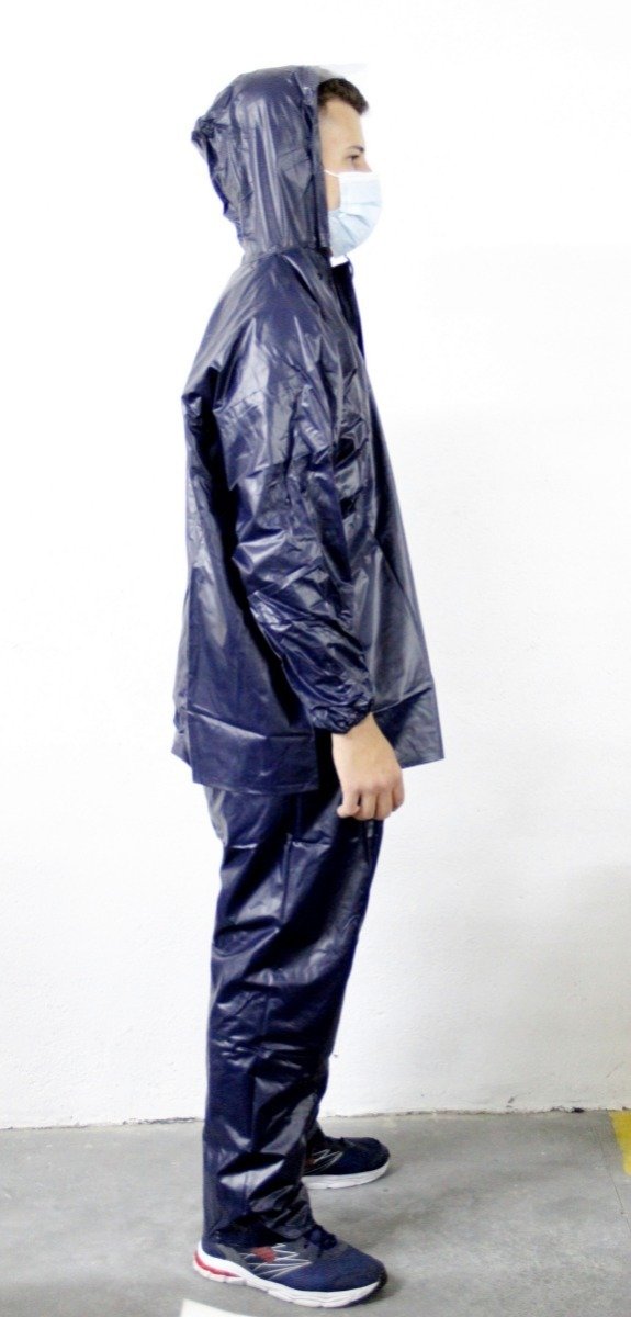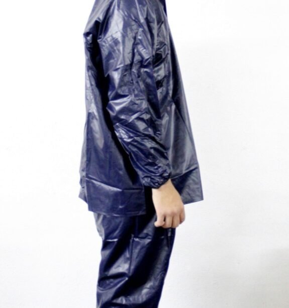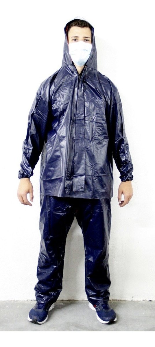 Capa de chuva longa com capuz, sendo casaco e calça, de poliéster impermeável, flexível e resistente. Com fechamento em zíper, e elástico na cintura da calça.