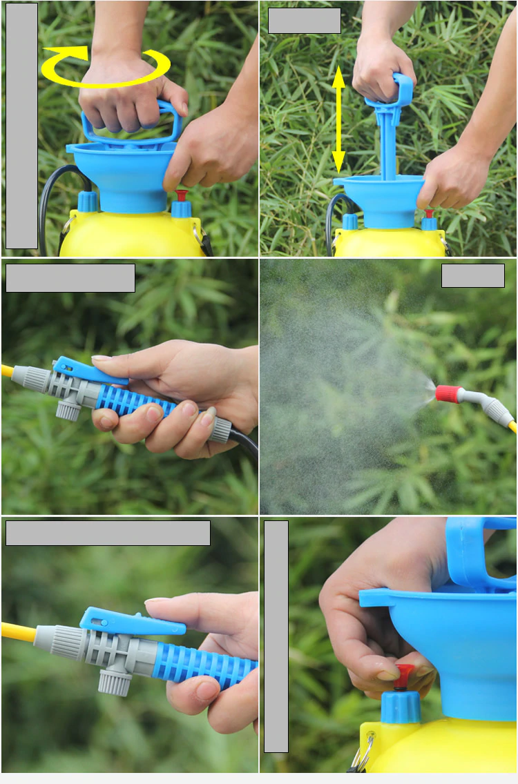 O pulverizador manual tem um forte frasco com uma escala de medição, uma bomba para criar pressão e válvula de controle de pressão automático. Além de possuir cabeça com ajuste de jato. É utilizado em jardim e plantações para proteger plantas de pragas e doenças, bem como durante a fertilização e adubação.