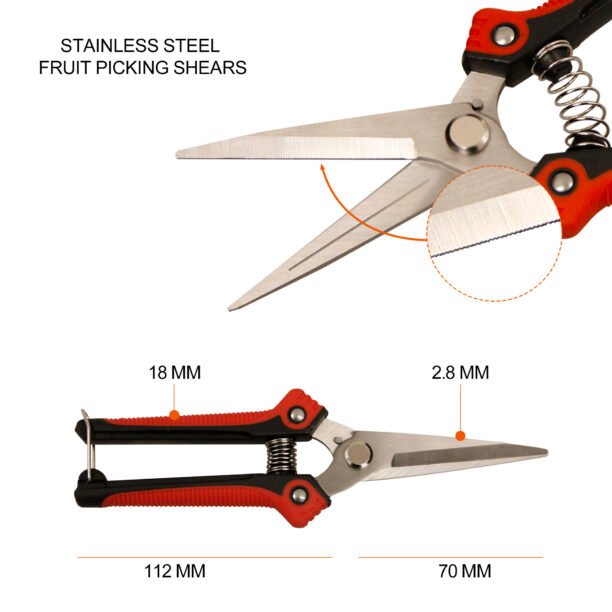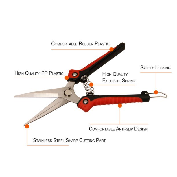Apontou design é mais fácil de cortar flores e frutos pick. O projeto está de acordo com a ponta do dente, ele economiza trabalho e não é fácil de deslizar. PP cabo de plástico pega skid resistente, se sentir confortável. O reset primavera abre a fivela de bloqueio, a mola de reposição será aberto automaticamente, e a operação é simples.