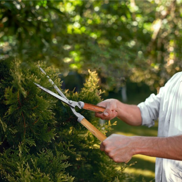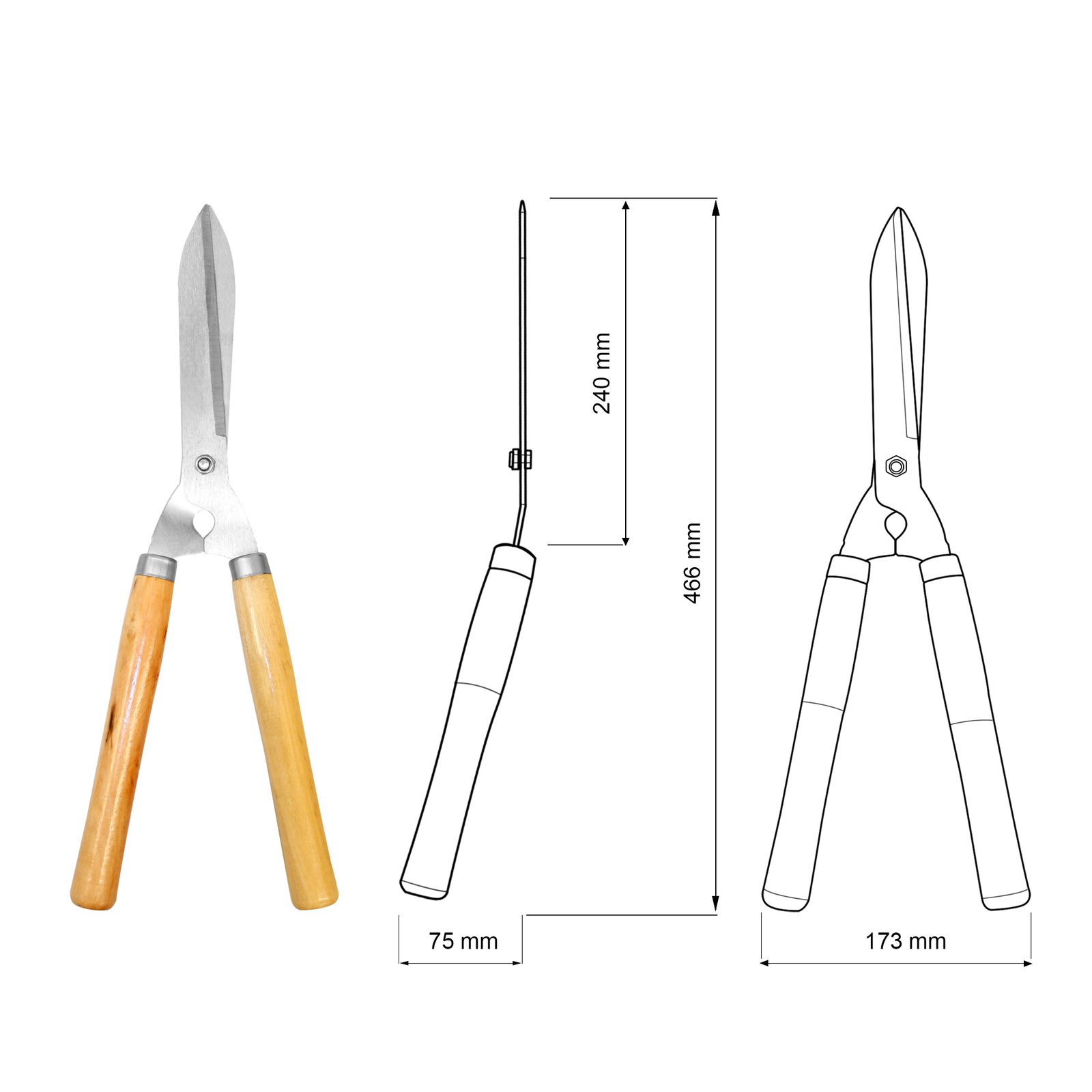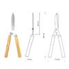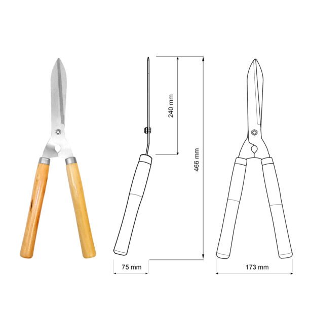 A tesoura é própria para desbaste e acabamento de cerca-viva, arbustos e para aparar a grama. Também pode ser utilizado na topiaria (arte de podar plantas em formas ornamentais). Seu cabo, além de ser produzido com madeira, tem formato ergonômico, proporcionando mais conforto durante o uso.