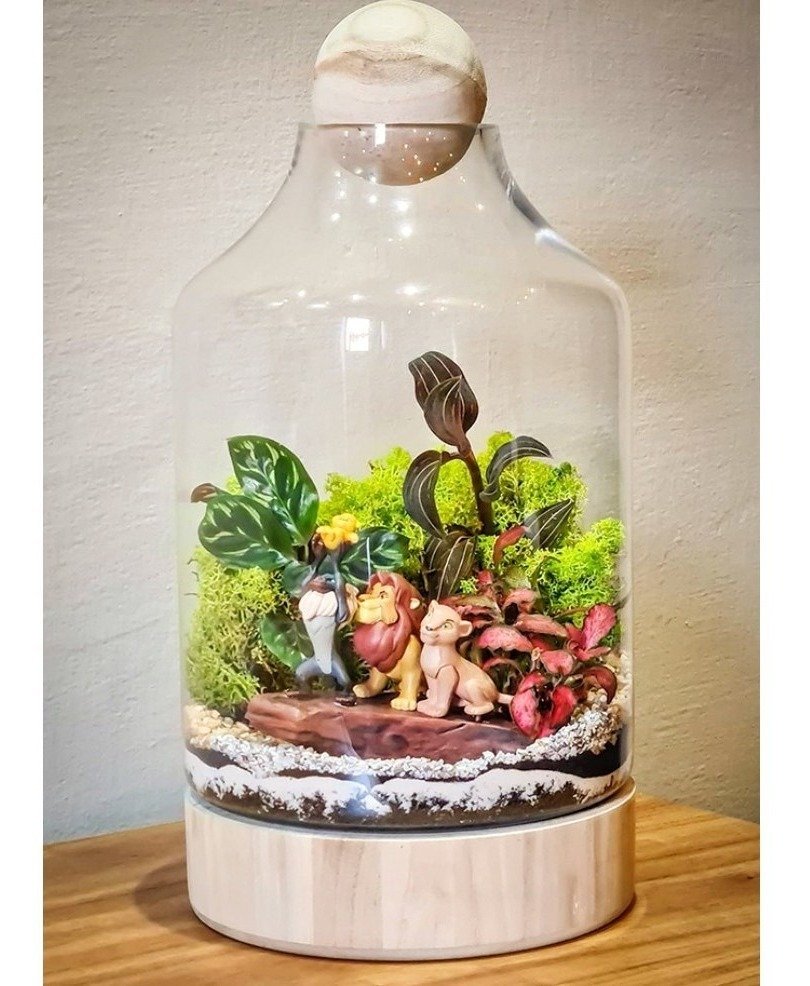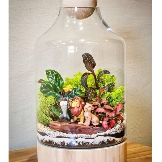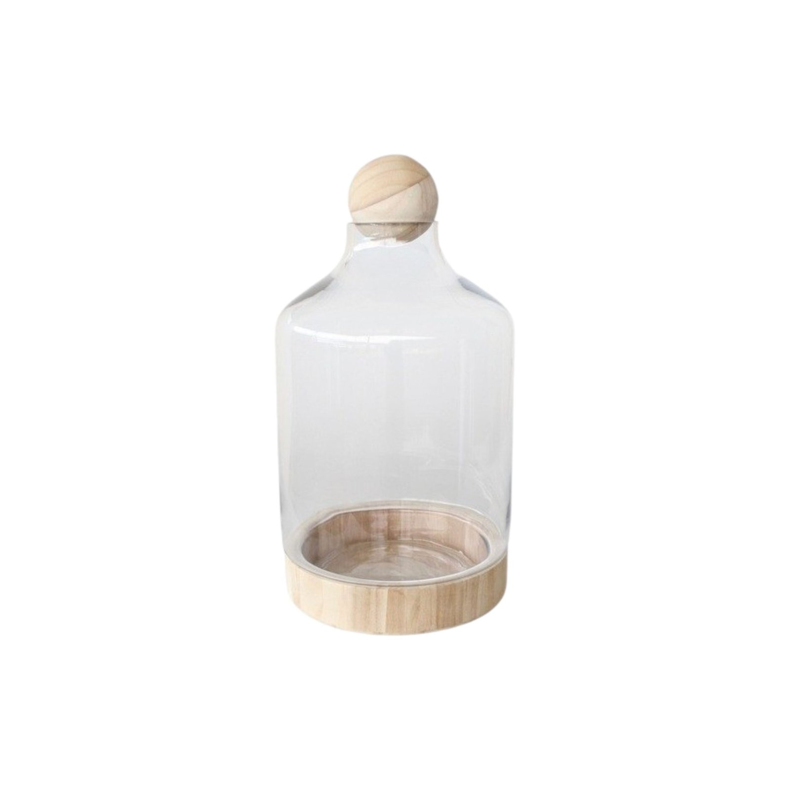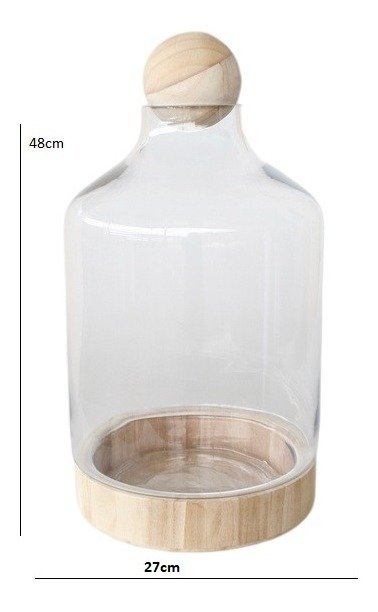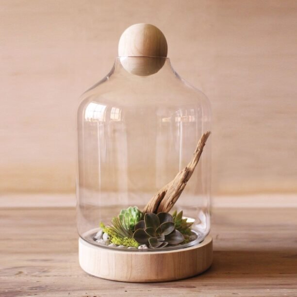Vaso de vidro com base em madeira para terrários