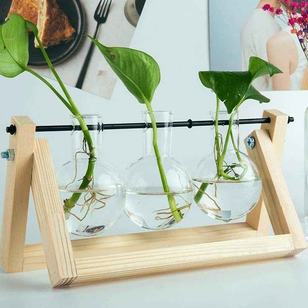 Vaso De Vidro Bulbo Plantador Com Suporte De Madeira