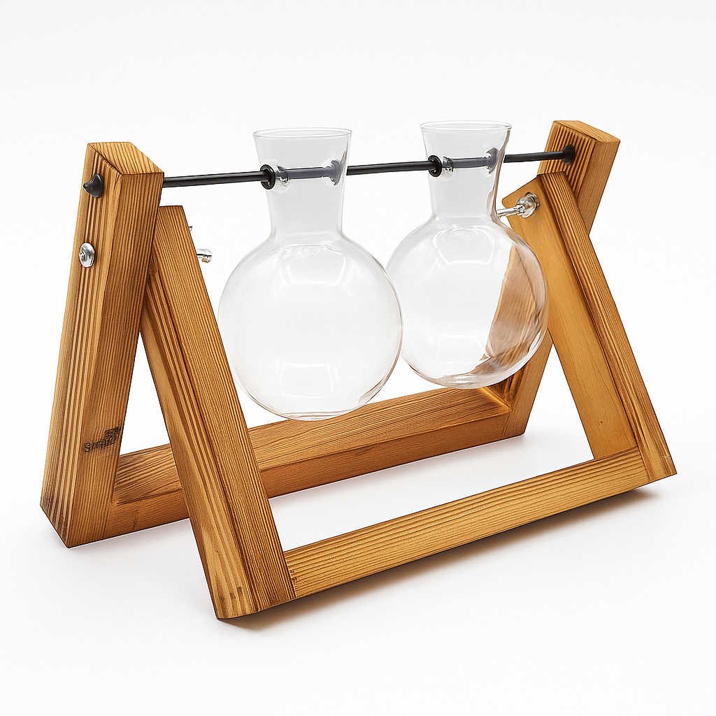 Aposte no charme da hidroponia decorativa com este conjunto de vasos de vidro em formato de bulbo com suporte de madeira. Ideal para ambientes internos, ele une estilo retrô, design elegante e a experiência de cultivar suas plantas preferidas sem solo.